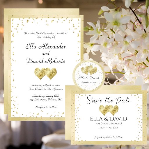 Elegant Gold Wedding Hearts Wedding Invitation designed with Gold Coloured Confetti Accents and Bright Gold Coloured Wedding Hearts on a white background. The front text includes: The Bride and Groom's Names, Wedding Date, Time, Location and Reception Details. The reverse side text includes: Your Reception and RSVP Details on a gold coloured background with Gold Coloured Confetti. To personalise, simply insert your details into our easy template, replacing the sample text. Be sure to view the matching stationery and accessories for this Elegant Gold Wedding Hearts Collection.