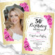 Elegant floral feminine 50th birthday invitation with your photo at the back of the card. Glam design with faux gold. Features pink roses, script font and confetti. Perfect for a stylish adult bday celebration party. Personalise with your own details. Can be customised for any age! Printed Zazzle invitations or instant download digital printable template.