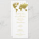 Elegant vintage travel inspired wedding ceremony program card design features a world map border design with a metallic champagne gold shimmer appearance. Personalise the custom text with the bride and groom's name, wedding date, ceremony information, bridal party, and thank you message.