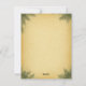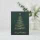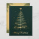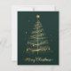This elegant Christmas greeting card features a beautifully designed golden Christmas tree set against a dark green background. The tree is adorned with delicate golden ornaments and topped with a shining star. The intricate design includes shimmering golden lines and sparkles, creating a festive and luxurious feel. At the bottom of the card, the words "Merry Christmas" are written in an elegant golden script, adding a warm and joyful touch to the overall design. This card is perfect for sending holiday wishes to friends and family, capturing the essence of Christmas with its sophisticated and festive look. The back of the card continues the festive theme with a vintage-style design. It has an aged paper texture, bordered by green pine branches. The centre is blank, providing ample space for writing a personal message, adding a touch of nostalgia and charm.