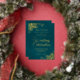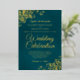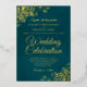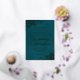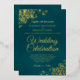 This elegant wedding invitation features real foil printing on a dark teal colored background. The beautiful design has fancy script lettering with ornate floral curls and swirls in the corners. Stylish, elegant, sophisticated, and chic, this invitation is fancy and glam. Wonderful and classy way to invite your friends and family to share in your joy on your special day.
