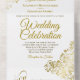 This beautiful wedding invitation is elegant, timeless, and classy. The fancy gold and white design features ornate golden faux foil curls and swirls with fancy script lettering. The all-in-one design includes a tear-off rsvp postcard making it easy for your guests to respond.