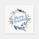This elegant Christmas napkin features a wreath with golden reindeer and blue and grey greenery. Merry Christmas is written in a beautiful handwritten script.