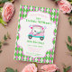 This elegant birthday invitation showcases a charming pink golf cart decorated with balloons, cake, and pastel-coloured gifts—perfect for celebrating a stylish woman’s special day. The background features a classic pink and green argyle pattern, capturing that timeless preppy golf aesthetic loved throughout the golf world.