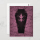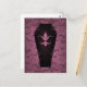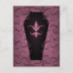 A post card with an elegant black gothic coffin with a grungy purple damask background pattern on it.