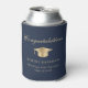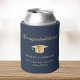 Toast the graduate at their graduation party with this elegant blue can cooler featuring a gold grad cap, "Congratulations" in a classic script and the graduate's name, school and class year in simple modern typography.