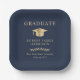 Elegant dark blue graduation party paper plates featuring a gold grad cap, "Graduate" and the graduate's name, school and class year in classic serif typography.