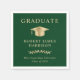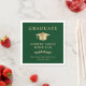 Elegant green graduation party napkins featuring a gold grad cap, "Graduate" and the graduate's name, school and class year in classic serif typography.