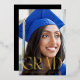 Modern style typeface of "Grad" letters with full bleed photo. Choose your foil colour, gold, silver or rose gold. Photo backer optional. Add an event details to the back side, or future plans, or more photos as desired.