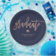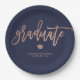 These modern, elegant graduation paper plates feature trendy faux rose gold typography on a navy blue background.