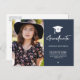 Trendy chic classic dark navy blue and white typography script and graduation hat making a stylish grad party invitation announcement postcard. ++++++++++ Easy to personalise with your photo, details and monogram / name initials on both sides! ++++++++++++++++++++ If you need a specific colour, please message the designer through the button below.