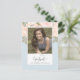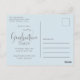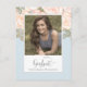 Celebrate your graduate in style with these graduation party invitations featuring a customizable photo template and elegant calligraphy script paired with modern typography. Accented with blush pink floral details and soft light blue tones, this chic and elegant design is perfect for any high school or college grad party invite. A beautiful blend of personalization and sophistication to set the tone for an unforgettable celebration.