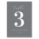 This elegant wedding table card features a minimalist design with a muted gray background and crisp white typography. The layout centers around a large, bold numeral "3" in a clean sans-serif font, creating a focal point that is both sophisticated and understated. Above the number, the word "table" is elegantly scripted in lowercase letters, adding an inviting touch. Customizable text fields allow for personalization with names and dates, making it perfect for formal occasions. The overall aesthetic exudes refined sophistication, ideal for weddings or upscale events.