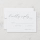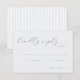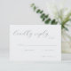 This elegant wedding RSVP card features a minimalist layout with ample white space, creating a clean and sophisticated appearance. The design includes a flowing cursive script for the phrase "kindly reply," paired with a subtle serif font for the response deadline. Soft grays on a light background enhance readability while maintaining a refined mood. Perfect for formal events, this card combines style and functionality, guiding guests to indicate their attendance status clearly.