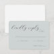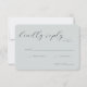 This wedding RSVP card features a minimalist and elegant design with a soft grayish-blue background, creating a serene and sophisticated atmosphere. The layout includes an elegant cursive script for the phrase "kindly reply," paired with simple serif fonts for clear response options like "happily accepts" and "sadly declines." Generous spacing and clean lines ensure readability while maintaining a formal tone, making it perfect for weddings or other formal events requiring RSVPs. The customizable fields allow guests to easily indicate their attendance details, enhancing both functionality and style.