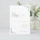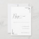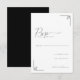 This elegant RSVP card features a minimalist design with ample white space, creating a clean and sophisticated look. The grayscale color palette includes black text and light gray decorative accents in the corners, adding subtle visual interest. The layout is vertically oriented, with a stylish cursive script for "RSVP" and simple sans-serif fonts for clear instructions, ensuring both formality and readability. Perfect for formal events, this card conveys an understated sophistication, making it ideal for weddings or upscale gatherings.