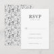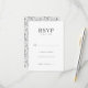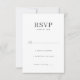 This elegant RSVP card features a minimalist design with a clean, white background and grayscale tones. The layout is centred and balanced, showcasing bold serif typography for the "RSVP" heading and a lighter weight font for the response deadline. Below, there are options to indicate acceptance or decline in a simple sans-serif typeface, along with space to note the number of attendees. The overall style conveys formality and sophistication, making it ideal for weddings or formal events where clear communication is key.