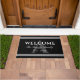 Elegant Greek key meander border welcome doormat. Make your own custom monogrammed indoor / outdoor door mat with custom background colour and text. Add your own welcome message, family name, surname, initial letter or funny quote. Classy gift idea for new home / housewarming, store, shop, company office, business etc. Chic typography template with beautiful geometric fret. Create your own personalised entry mat / rug for front door / entryway or hall. Customisable home decor / decorations for your house. Unique luxury gift ideas for newly weds, wedding couple, bride and groom, husband and wife etc.