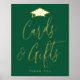 Modern graduation party sign featuring an illustration of a gold foil graduation cap at the top with "Cards and Gifts" displayed in a gold foil calligraphy script on a green background. Personalize the green and gold foil graduation sign with your custom text at the bottom (currently shown with "Thank You"). The foil graduation party sign is perfect for both high school and college graduates.