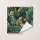 A luxury bath towel set featuring an elegant green and gold monsera leaves pattern and space for initials.