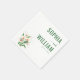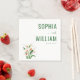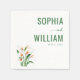 These wedding napkins feature a clean, minimalist design with a balanced layout that includes elegant calla lily illustrations on the left and bold green serif typography for names on the right. The color palette is dominated by various shades of green, complemented by the natural hues of white, orange, and green in the flowers. The overall style is sophisticated and refined, perfect for formal celebrations, conveying an atmosphere of elegance and simplicity. Ideal for weddings or special occasions, these napkins offer a timeless aesthetic that enhances any table setting.