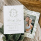 Announce your upcoming wedding to friends and family with this Elegant Sage Green Chinoiserie Victorian Floral photo save the date. This design displays your monogram initials surrounded by a crest of intricate sage green chinoiserie and baroque motifs. "Save the Date" is featured in a sage green calligraphy script with your wedding details shown below. The back of the card features your vertical engagement photo with a sage green Chinoiserie-inspired floral pattern background.