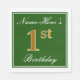 This simple and elegant paper napkin design features a message like "Name-Here’s 1st Birthday" (with the "1st" having a faux gold-like colouring) within a green-coloured square area featuring a simple border outline. The name is in a white-coloured script-like text, and can be personalised. Napkins like these could perhaps be used at a birthday party for somebody who is celebrating their first birthday. [~Z0000137]
