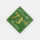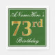 This simple and elegant paper napkin design features a message like "ANameHere’s 73rd Birthday" (with the "73rd" having a faux gold-like colouring) within a green-coloured square area featuring a simple border outline. The name is in a white-coloured script-like text, and can be personalised. Napkins like these could perhaps be used at a birthday party for somebody who is celebrating their seventy third birthday. [~Z0000137]