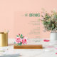 This elegant wedding menu card features a clean, vertical layout with a soft green title "the DRINKS" set against a light background. The design is divided into three sections—Beer, Wine, and Spirits—each listing various options in a simple sans-serif font. A delicate illustration of pink roses adds a touch of natural beauty to the bottom left corner, enhancing the sophisticated and inviting mood. Perfect for weddings, this menu combines modern typography with classic floral elements to create an appealing and organized presentation.