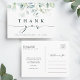 This thank you postcard features painted watercolor eucalyptus, botanical green, and light blue leaves with modern calligraphy. Perfect for weddings, birthdays, graduations, and other events.