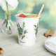 This customisable paper cup features a lovely watercolor design of elegant green foliage. A delicate stem with multiple branches and soft, green leaves is repeated three times around the cup. The leaves are rendered in a watercolor style with subtle variations in colour, from a light, airy green to a deeper, more saturated shade, creating a natural and artistic look. The background is a soft, neutral grey, which allows the green leaves to stand out beautifully.