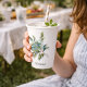 Below each leaf cluster, there is a space for customisable text, shown here in a flowing script font. This makes the cup perfect for any event, from a wedding celebration with "Vanessa & Michael Est. 2025" to a baby shower with "It's a Boy! Mason's Baby Shower." You could also use it for "Isabella's Bridal Shower 2025," "Happy Birthday, Sarah!," or even a "Miller Family Reunion."