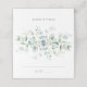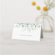 This wedding place card features painted watercolor eucalyptus, botanical green, and light blue leaves with modern calligraphy.
