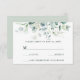 This wedding RSVP card features painted watercolor eucalyptus, botanical green, and light blue leaves.