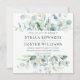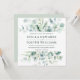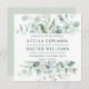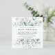 This square wedding invitation features painted watercolor eucalyptus, botanical green, and light blue leaves with modern calligraphy.