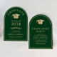 Elegant arch-shaped green college graduation announcement and party invitation featuring a gold grad cap and the graduate's name, class year, college or university, degree and major or honours in classic gold serif typography. On the back, add your party details.