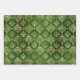Elegant green 3-sheet wrapping paper collection with vintage gold damask on sheet 1, a pattern of gold reindeer on sheet 2, and glittery gold snowflakes on sheet 3.