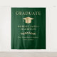 Elegant green graduation party welcome tapestry and photo booth backdrop featuring a gold grad cap, "Graduate" and the graduate's name, school and class year in classic gold typography.
