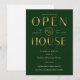 Create stylish business event invites for your house warming or new business party with this faux gold effect Open House Invitation. This elegant emerald green and gold open house event invitation features a trendy layout with sophisticated fonts, space for your logo and event details, perfect to invite guests to your Housewarming Celebration.