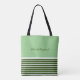 A stylish and monogrammed tote bag with green and white horizontal stripes on sage, personalised with her name and initials