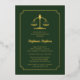 A libra legal scales of justice and scalloped frame gold foil and green graduation party invitation design that can be personalised for law or other legal field school graduations. Composite design by Holiday Hearts Designs (rights reserved).