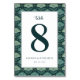 This elegant wedding table card features a sophisticated design with a central white space surrounded by a lush, dark green leafy pattern. The botanical theme is enhanced by stylized leaves and subtle cream accents, creating a vintage yet timeless feel. A bold number "8" in dark teal stands out prominently, complemented by delicate cursive typography for the word "table" and classic serif fonts for customizable names and date. The overall mood is formal and refined, perfect for adding a touch of nature-inspired elegance to your special day.