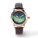 An Elegant Wristwatch with a Nature Scene picturing a Night Sky with Green Shades of Aurora Borealis, also knows as Northern Lights. The original design features a motivational text saying "The sky is the limit". This text can of course be customised to suit your own needs, or perhaps make it a personalised gift with a name added instead.