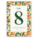 This elegant wedding table card features a charming watercolor peach border in shades of orange and green, creating a warm and inviting atmosphere. The central white rectangle highlights a bold forest green number "8" with the word "table" elegantly scripted above it. Customizable text fields allow for personalization with names and dates, while the sophisticated mix of serif and sans-serif fonts adds a modern touch to the classic design. Perfect for adding a natural and stylish element to your wedding reception, this card captures the essence of celebration and sophistication.