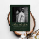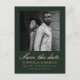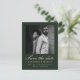 Simple and elegant dark green two photo wedding save the date announcement postcard features beautiful calligraphy script on the front with one photo, and a second arched shaped photo with wedding website details and return address on the back of the classic forest green wedding announcement postcard. Shop this chic wedding collection for coordinating wedding invitations, and additional modern colour options.
