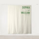 This wedding backdrop features a minimalist design with a soft, pale greenish-cream background that creates an elegant and clean appearance. The typography is the focal point, using bold uppercase letters for names and a delicate cursive script for "and," all in a deep forest green colour that evokes nature and tranquillity. The layout is vertically orientated with ample negative space, emphasizing clarity and sophistication. Perfect for a modern, understated wedding ceremony, this design conveys a mood of calmness and refinement, making it both functional and aesthetically pleasing.
