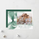 Celebrate the season in style with this elegant Christmas card featuring a stunning green watercolor bow against a white background. Personalise the design by adding your horizontal family photo in a unique offset layout. Your holiday greeting is displayed in classic green serif lettering, accompanied by your family name in an elegant handwritten script. With space for an additional photo on the back, this card allows you to share even more cherished memories. Perfect for spreading festive joy while showcasing your personal touch.