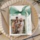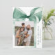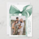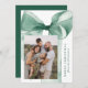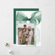 Celebrate the season in style with this elegant Christmas card featuring a stunning green watercolor bow against a white background. Personalise the design by adding your vertical family photo in a unique offset layout. Your holiday greeting is displayed in classic green serif lettering, accompanied by your family name in an elegant handwritten script. With space for two additional photos on the back, this card allows you to share even more cherished memories. Perfect for spreading festive joy while showcasing your personal touch.