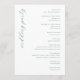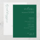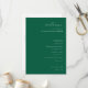 This elegant wedding program features a deep green background with a clean, balanced layout. The design combines script and sans-serif fonts to create a sophisticated look, highlighting the ceremony details in an organized manner. Its minimalist style emphasizes clarity and formality, making it perfect for a traditional yet modern wedding celebration. The ample negative space enhances readability while maintaining an inviting tone, ideal for guests attending a formal event.