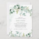 This trendy religious Baptism or Christening invitation features elegant watercolor eucalyptus greenery, with plenty of foliage, green leaves, and branches. They decorate a simple white background with modern script typography and a faux gold cross.